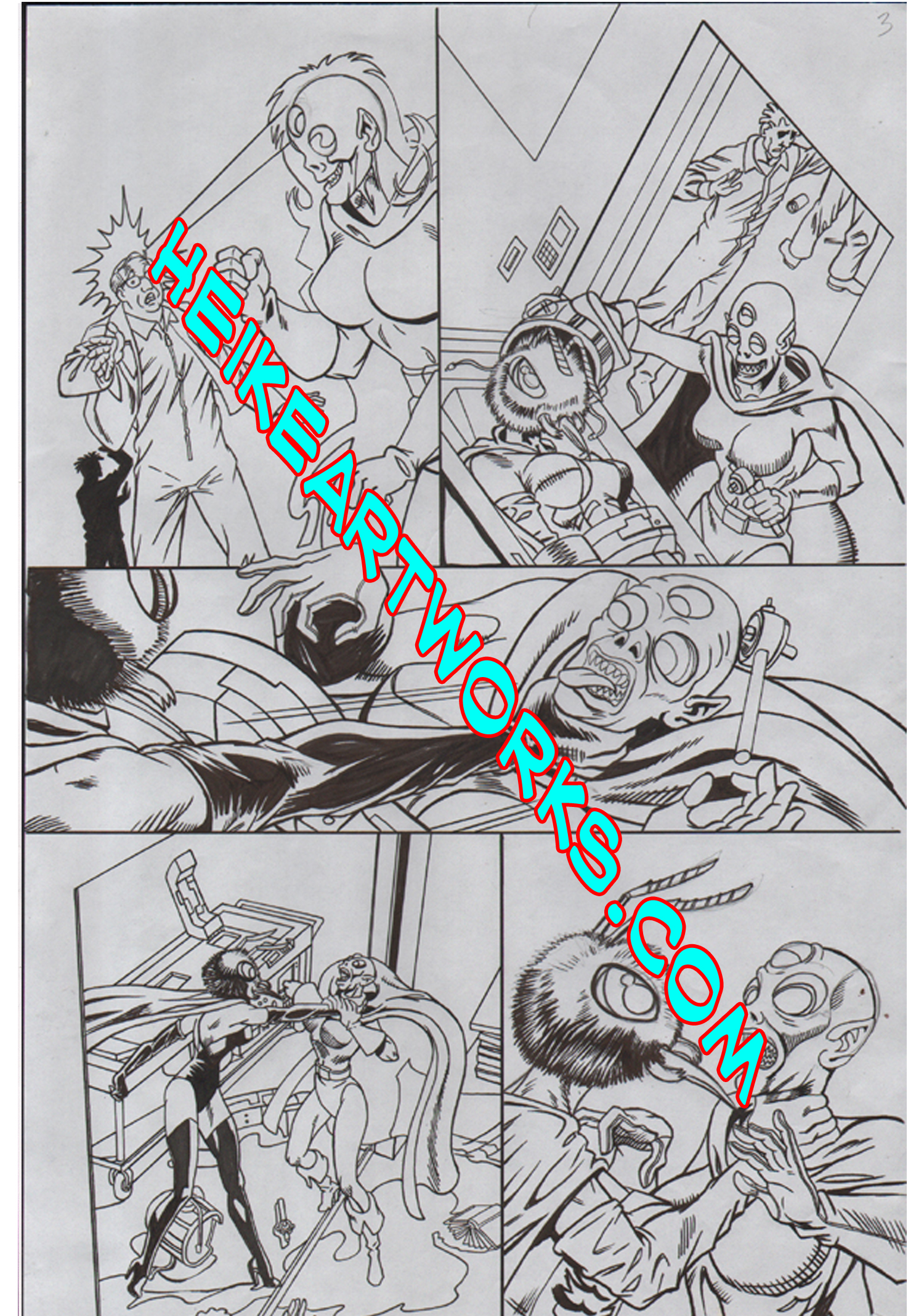 Original art for page 3 of Superbabes #2. This is for both the inks on 11X17 vellum (heavy weight tracing paper) by Stephanie Heike AND Mark Heike's pencils for this page!