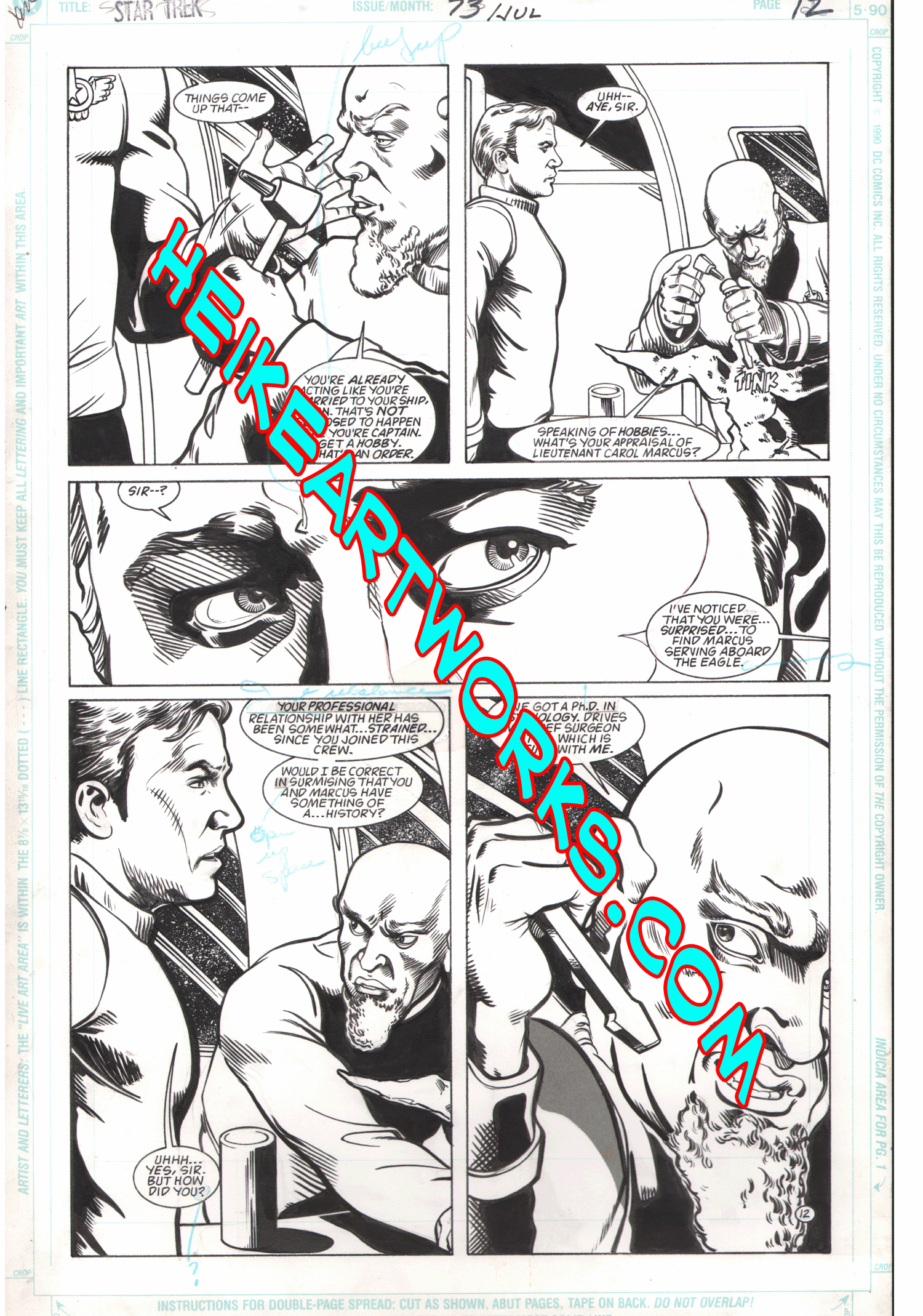 This is the actual, hand-drawn page of original comic book art an issue of DC Comics Star Trek- The Original Cast comic book series from 1995. Fans of Gene Roddenberry's classic science-fiction television series of the 1960's will love these nice characterizations of William Shatner as Captain James T. Kirk, Leonard Nimoy as Mr. Spock, and James Doohan as Scotty. . The art is 9 1/4" X 14 1/2", drawn by Rachel Forbes-Seese and Mark G. Heike, hand-drawn in black and white with pencil, pen, brush and india ink, on white 11" X 17" bristol board, preprinted with non-photo blue DC Comics margin grids. Beyond the excellent likenesses, there are some nice shots of the U. S. S. Enterprise, cool futuristic interiors and space backgrounds, and nice use of zip-a-tone and grease pencil effects. The pages can be autographed by artist Mark Heike, if the buyer so requests. Here's a chance to own some representative images from an American cultural icon of the last century.