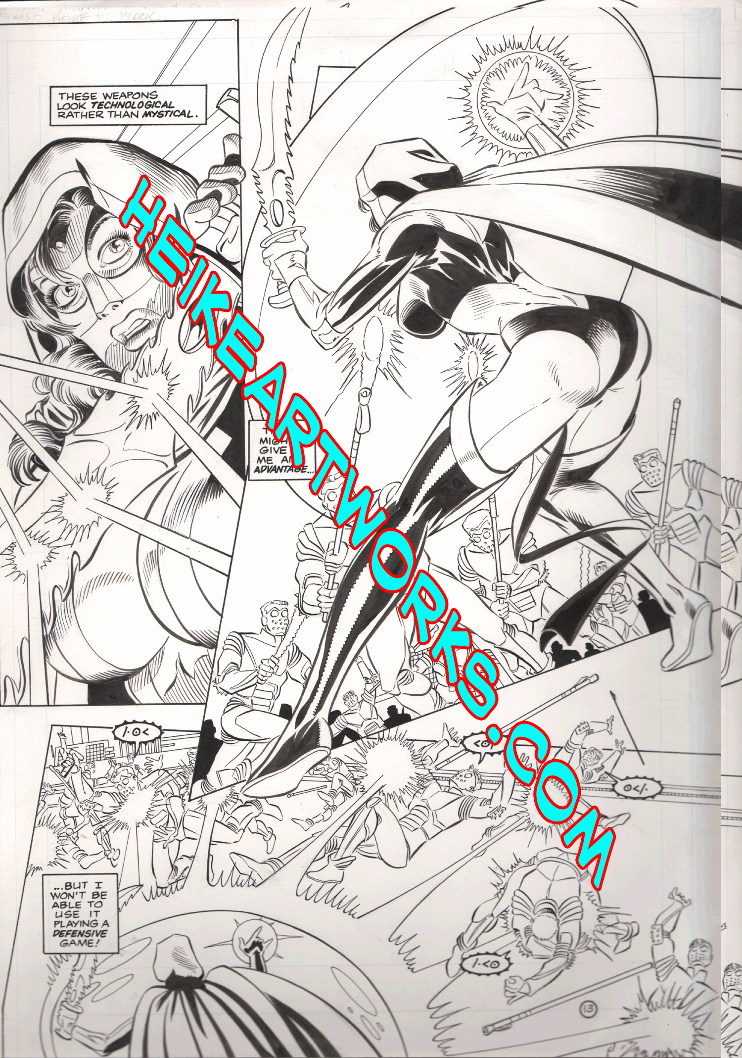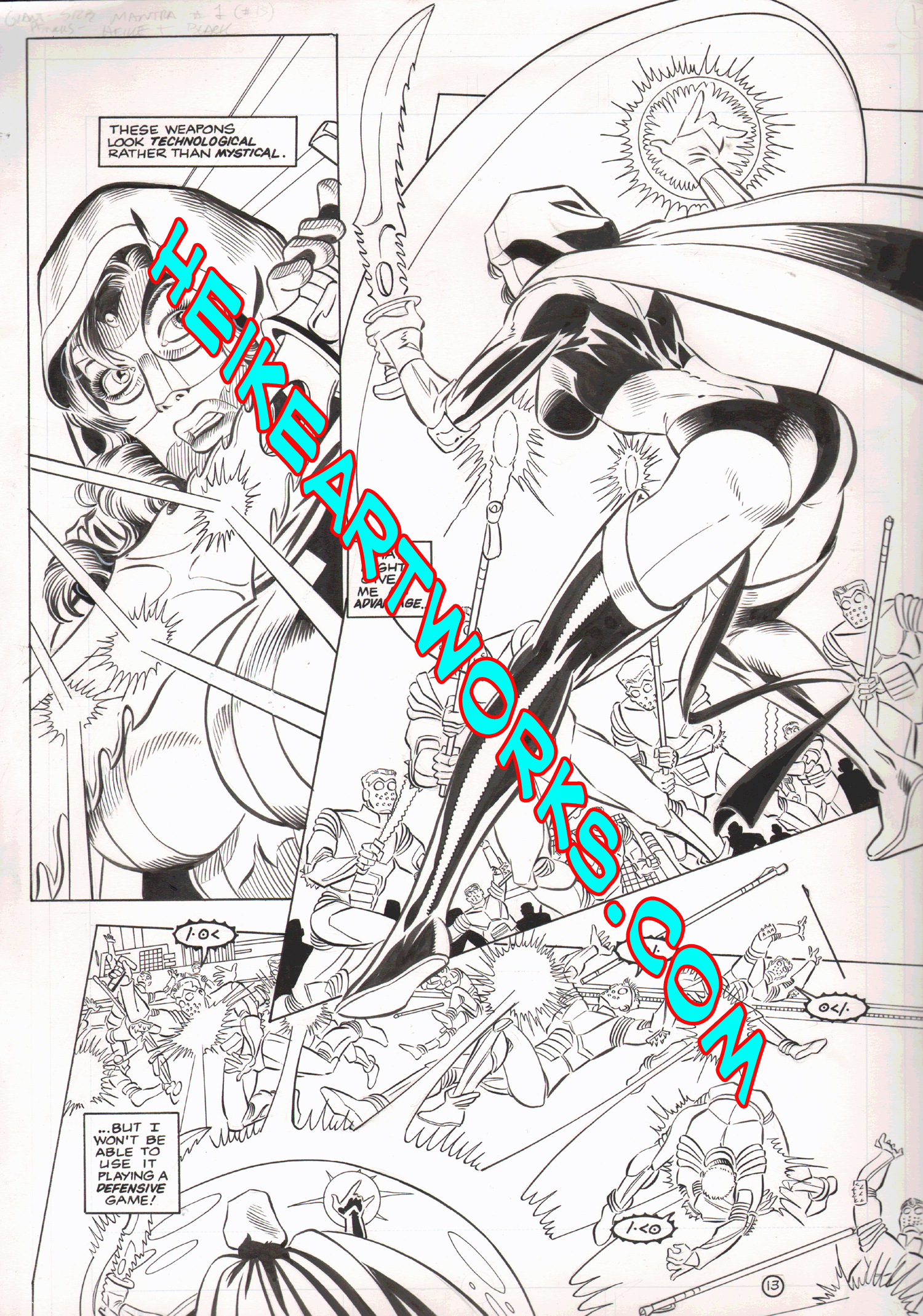 Here's a page from Malibu Comic's 1994 Mantra series, starring the sexy, sultry sorceress of the same name. This page is a one of a kind, original art pieces ,that the comic book was printed from. Art area is 11 1/4" X 16 3/4", (on a 12" X 18" piece of white two-ply bristol board, preprinted with non-photo blue Malibu margin grids) hand-drawn with pencil, pen and brush, finished in india ink. All were penciled by Mark Heike ( Best known for his long run as illustrator/editor on AC Comics, drawing such features as The Femforce, Nightveil, Ms. Victory, etc., as well as working on features like Star Wars, Xena, Warrior Princess, Star Trek, Lady Justice, Teenage Mutant Ninja Turtles, Magneto and Wolverine.) and inked by either Larry Welch , Ken Branch or Jim Amash. Mantra was, of course one of the first big "good girl art" female glamour heroines to come out of the great independant comics explosion of the early '90s, and was one of the flagship characters of the Malibu Ultraverse. These lovely examples of pin-up style comic art showcase Mantra in both her standard costume, and the temporary "techno armor" she wore for a short time, show her brandishing her deadly weapon, the "Sword of Fans", and cameo her male "alter ego", Lukasz; as well as her female human host, Eden Blake.