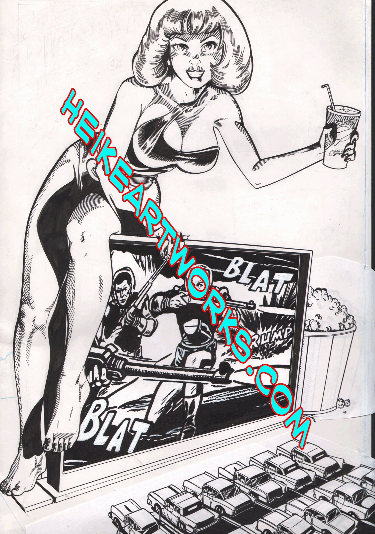 Upfront I'm going to tell you this one has a number of production paste-ups:(as you can see in the third photo) the cars, the popcorn (which were resized on a copier printed out and pasted before scanning--this was in the days before I could convince Mark that resizing could be done on the computer) and the art on the movie screen are all pasted up, but it is the original art used for the cover and Garganta herself is all there. !!X17 with paste-ups off the page! This is based on a rough by Stephanie Heike and pencilled and inked by Mark G. Heike. A really fun piece!