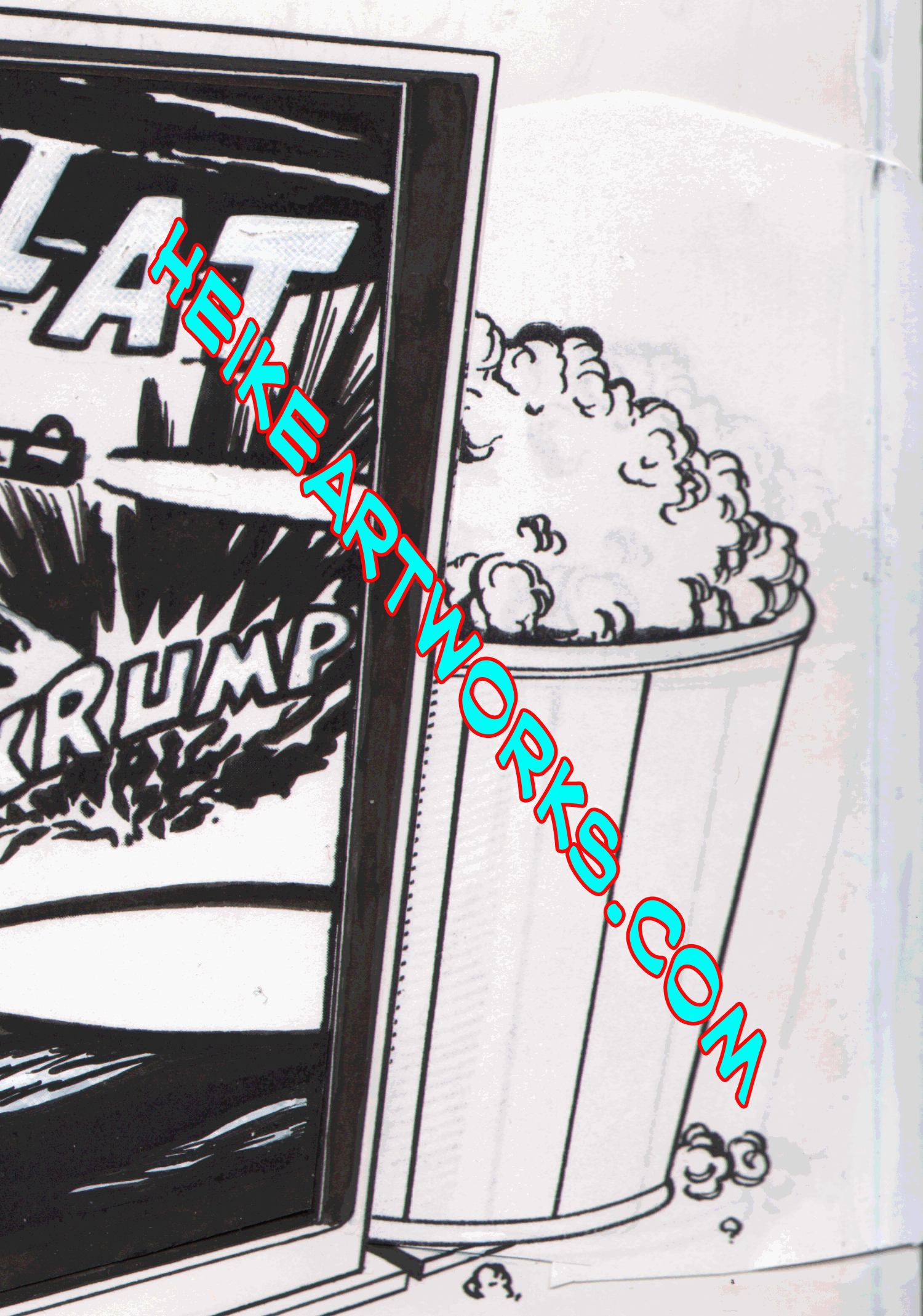 To Clarify (since we keep getting asked) Garganta and the soda are on the paper. The cars are completely pasted up (no image on the original board), the image inside the movie screen is pasted up. The popcorn is ON the bristol, BUT it has a resized image of the popcorn pasted up over it (which is stupid and I could have resized it digitally, but it took me YEARS to convince Mark out of his old paste-up habits!)