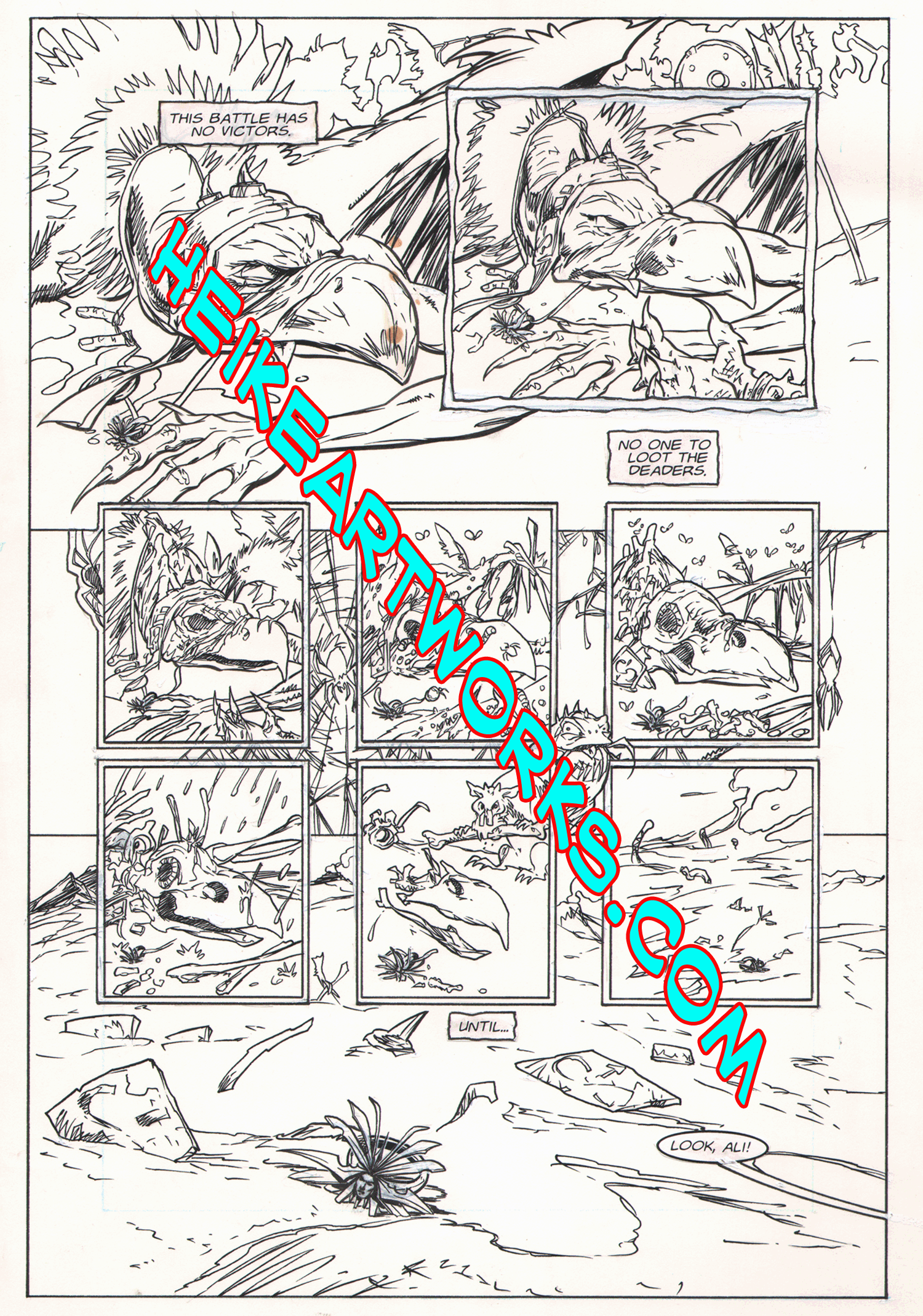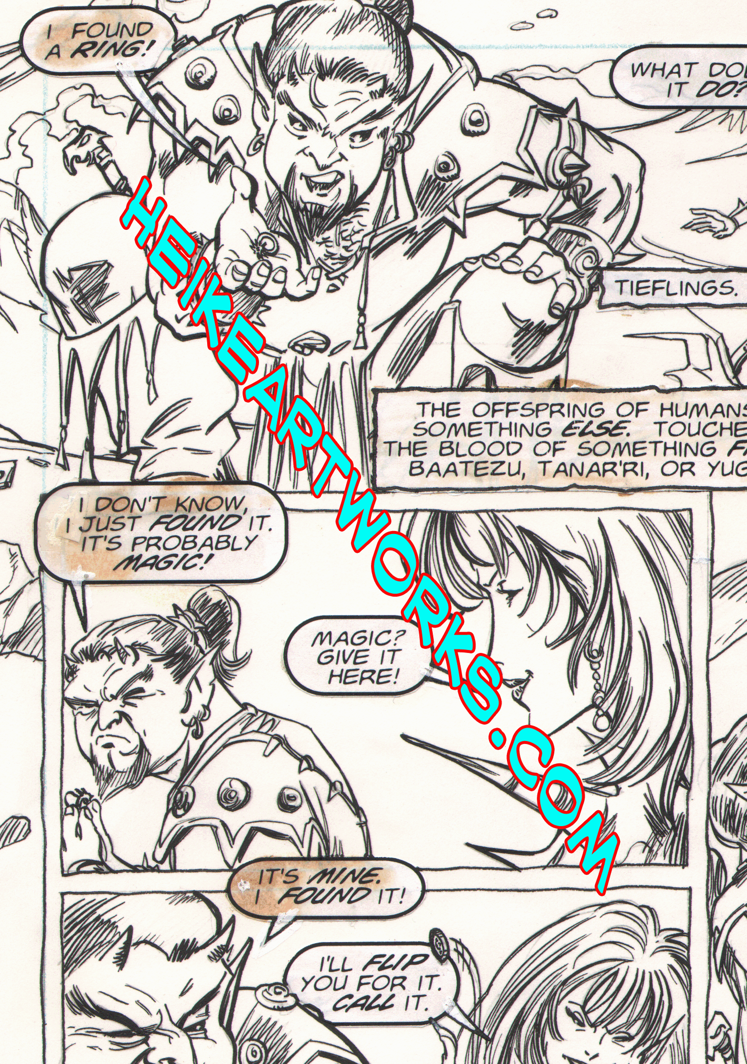 PlaneScapes TSR art by Gorby and Heike page twelve. This is an unpublished (it did appear on their website, but was never published as a comic book as originally intended!) original comic book page, drawn in the mid-1990's for a proposed (but never published) promotional comic for the TSR Planescapes fantasy role-playing game. The black and white line art is by Brad (Spawn, Parts Unkown, Guy Gardner, Superboy) Gorby and Mark( Femforce, AC Comics, Star Trek, Star Wars, TMNT, Wolverine, Xena, Warrior Princess) Heike. The original b&w art measures 13" high by 83/4" wide, hand-drawn with pencil, pen ,brush and india ink on a 161/4" X 11" sheet of double-ply white bristol board. Lettering is computer printed and pasted on. The line art is weird, sensual and other-worldly. A unique and unusual piece of art!! Collectors of Dungeons and Dragons, TSR material and fantasy art in general will treasure this rare find.