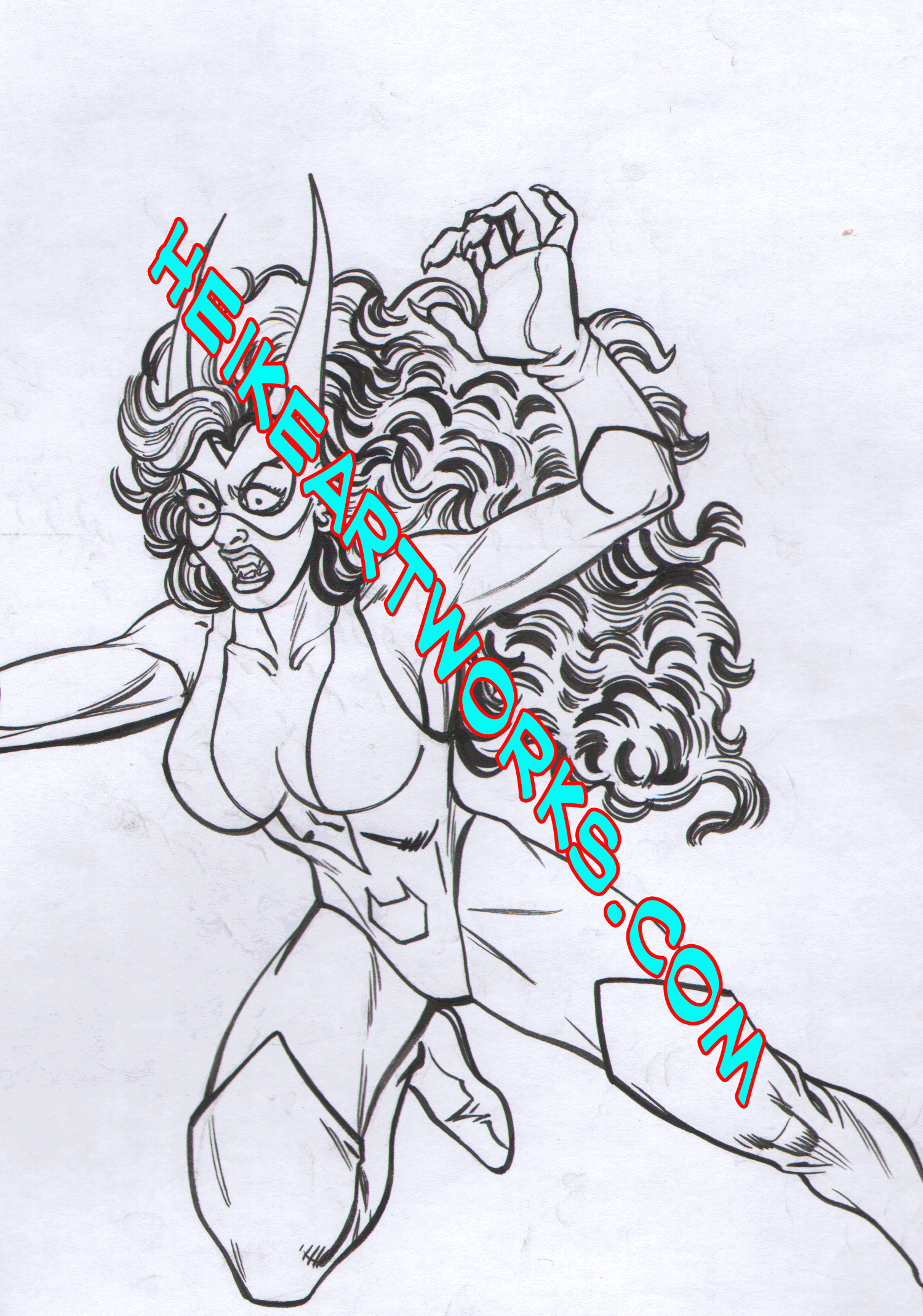 Femforce over featuring Ms. Victory, Synn and Tara versus a She-Cat imposter pencilled by Stephanie Heike and inked by Mark G. Heike.